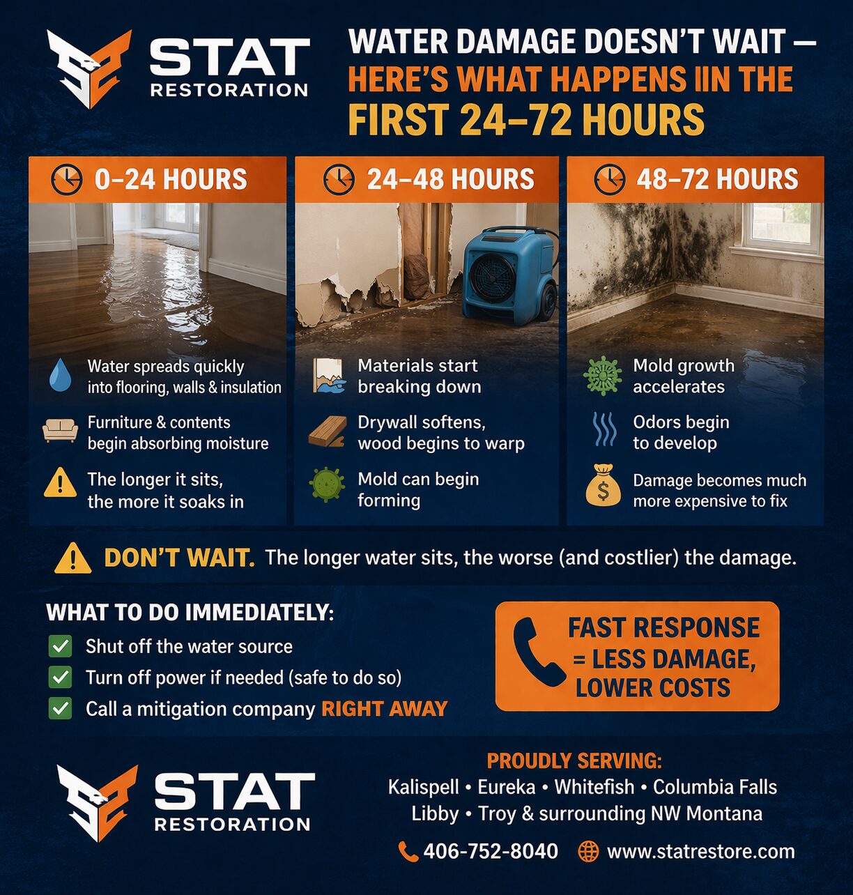 📍 Stat Restoration provides water damage mitigation services in Kalispell, Eureka, Whitefish, Columbia Falls, Libby, Troy, and surrounding Northwest Montana communities.